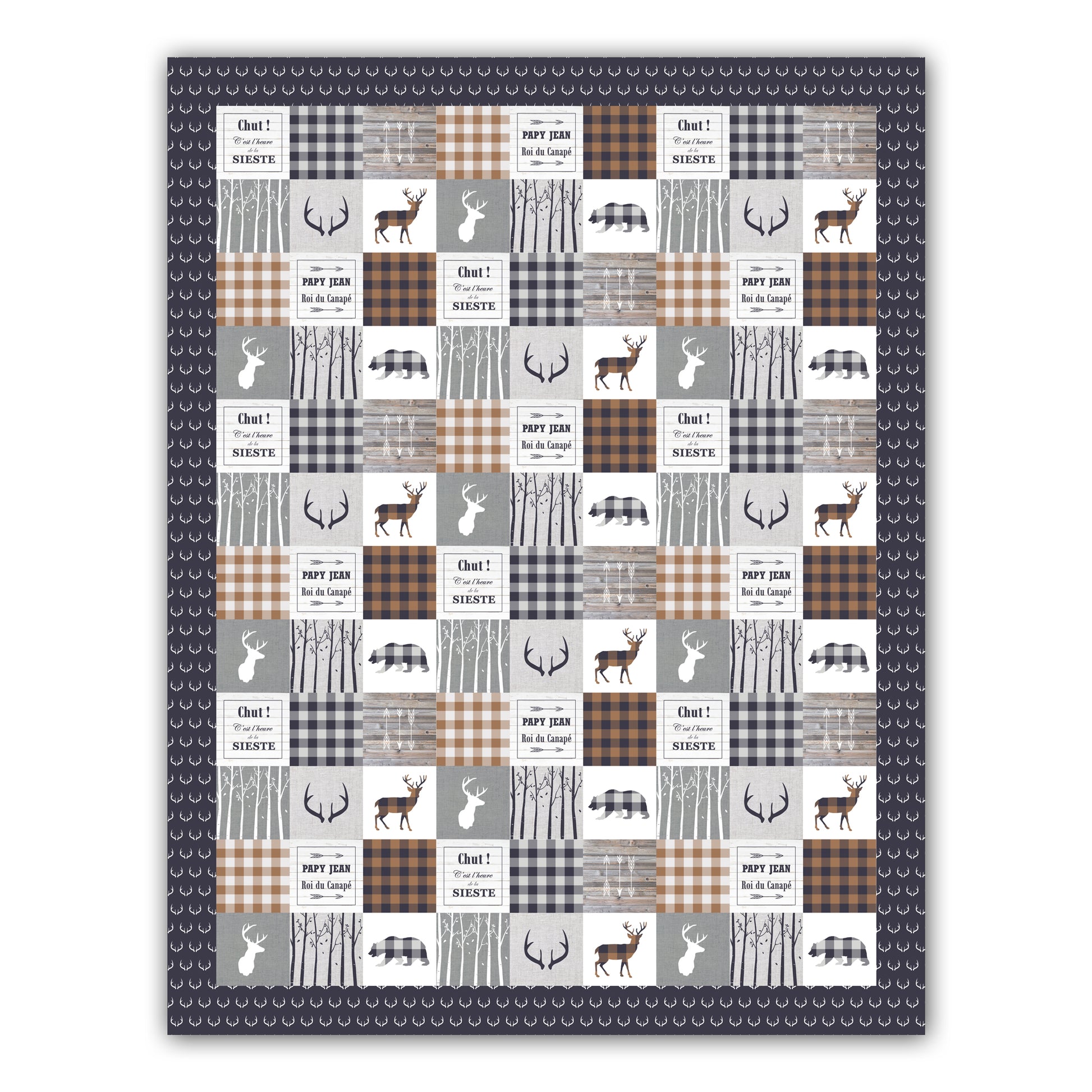 Esta colcha en patchwork para hombre, personalizada con mensajes, fácil de realizar, está pensada para los quilters masculinos, con sus cuadrados en colcha, su tema "animales del bosque" ilustrado con osos y ciervos, y sus tonos azul noche, gris y marrón.