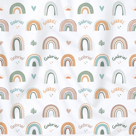 Tissu enfant imprimé arc-en-ciel personnalisé du prénom vert bleu beige