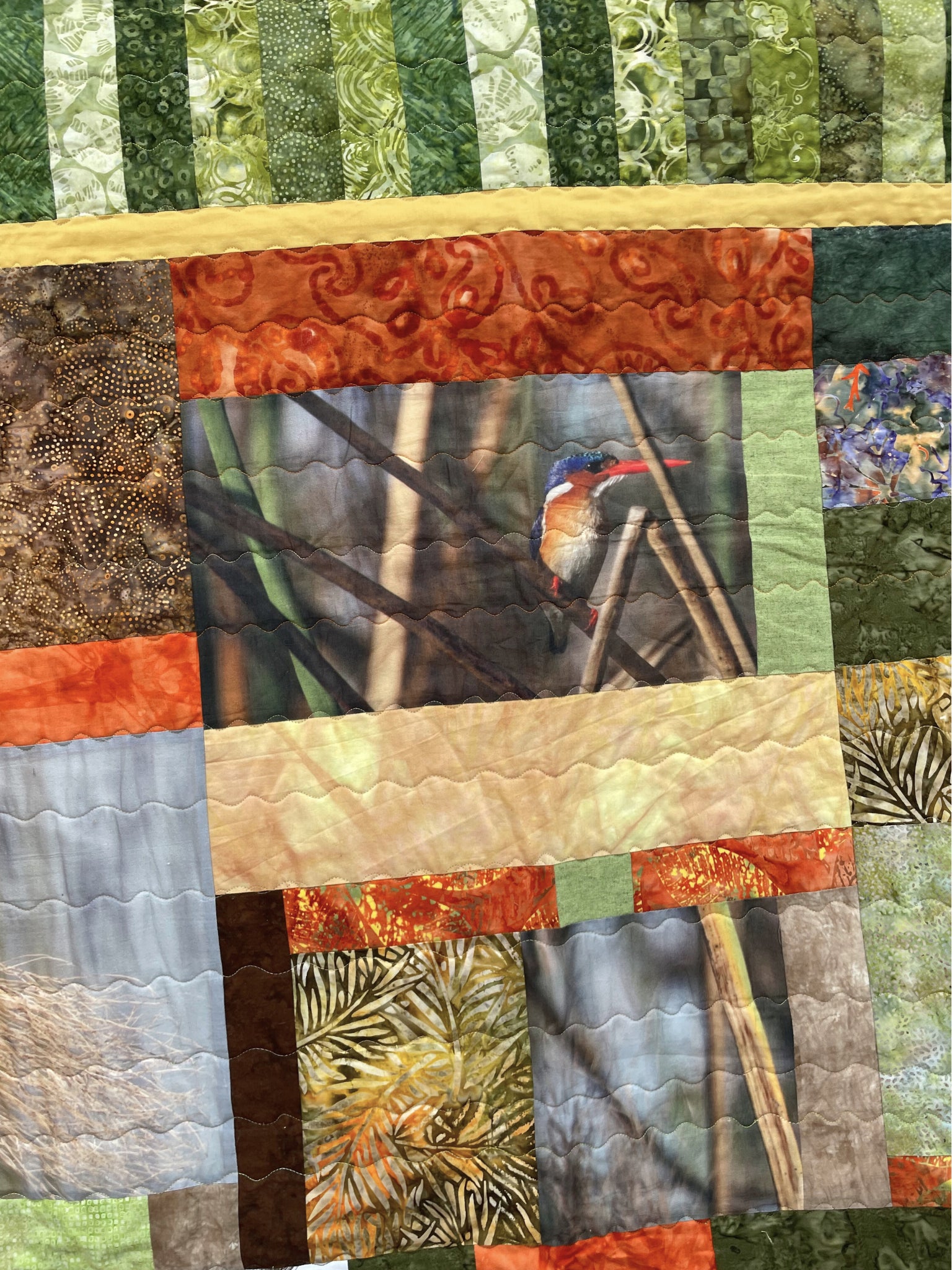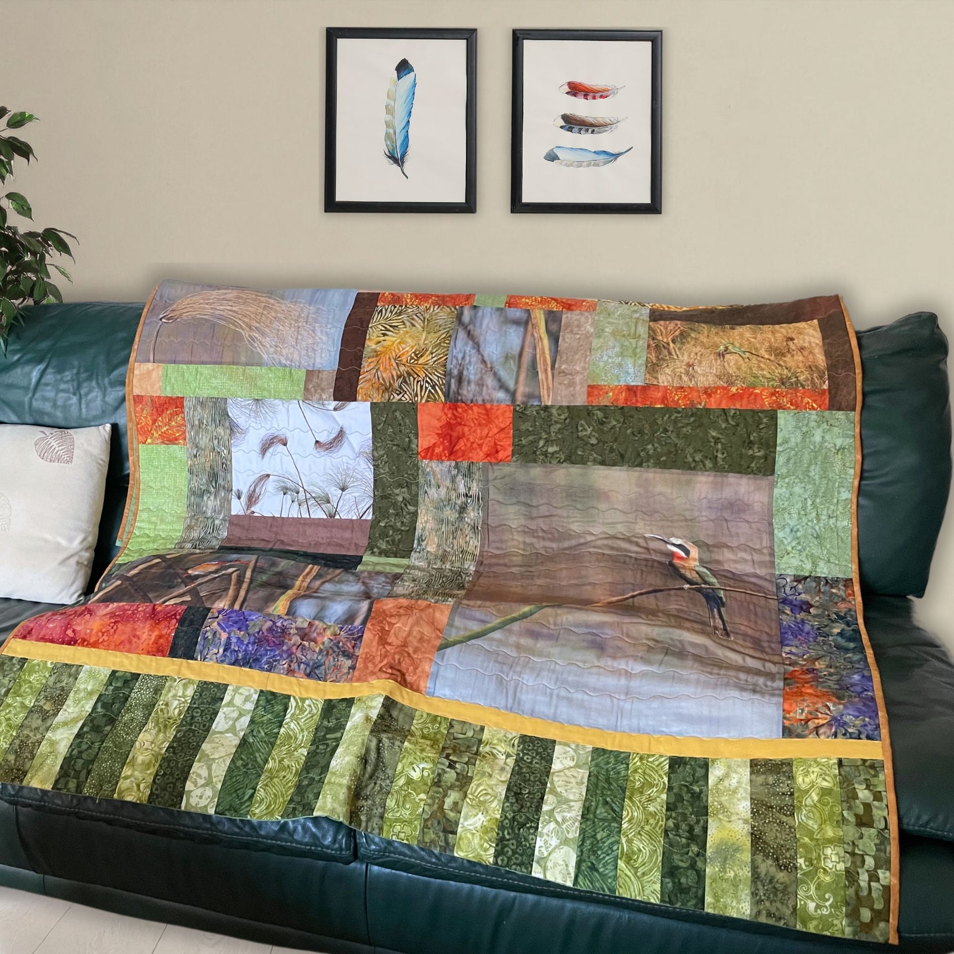 Plaid de patchwork contemporain, motif oiseaux dans un camaieu de verts, marrons etocres avec des accents orange.